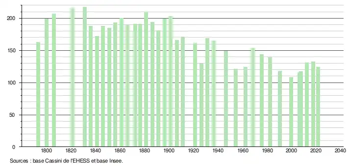 L'évolution du nombre d'habitants est connue à travers les recensements de la population effectués dans la commune depuis 1793. Pour les communes de moins de 10 000 habitants, une enquête de recensement portant sur toute la population est réalisée tous les cinq ans, les populations légales des années intermédiaires étant quant à elles estimées par interpolation ou extrapolation[11]. Pour la commune, le premier recensement exhaustif entrant dans le cadre du nouveau dispositif a été réalisé en 2007[12].