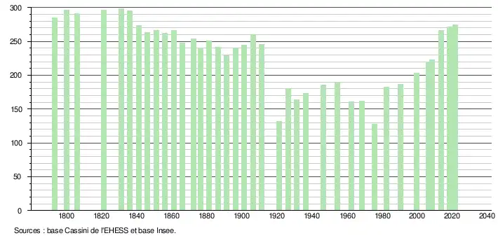L'évolution du nombre d'habitants est connue à travers les recensements de la population effectués dans la commune depuis 1793. Pour les communes de moins de 10 000 habitants, une enquête de recensement portant sur toute la population est réalisée tous les cinq ans, les populations légales des années intermédiaires étant quant à elles estimées par interpolation ou extrapolation[19]. Pour la commune, le premier recensement exhaustif entrant dans le cadre du nouveau dispositif a été réalisé en 2008[20].