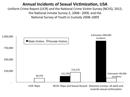 - « D'après les estimations, 4,4 % des détenus en prison et 3,1 % et des détenus en pénitencier ont rapporté avoir été victimisés sexuellement par un autre détenu ou un membre du personnel dans les derniers 12 mois ou depuis l'entrée dans l'établissement, si cela fait moins de 12 mois. »