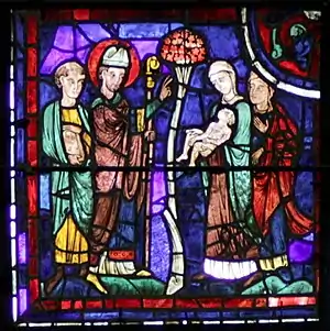 L'évêque tient cette fois ci une crosse, et non plus une croix de procession. Dans le quadrilobe, les témoins assistent aux deux miracles supérieurs. Dans un autre épisode, Sévère indique que Martin avait pris de loin une procession funéraire pour un rite païen, et l'enfant mort pour une statue qui était promenée à travers champs[6], « car les paysans, dans leur aveuglement insensé, ont l'habitude de porter autour de leurs champs des images de démons recouvertes d'étoffes blanches »[7] ; ce qui expliquerait le traitement très cadavérique et la nudité du petit enfant, qui n'est pas ressuscité dans cet autre épisode. |