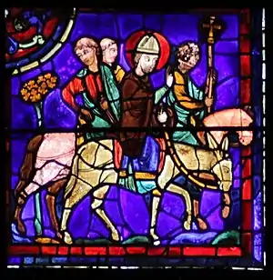 Détail mentionné par Sulpicius, Saint Martin est représenté montant un âne, en signe d'humilité, alors que ses clercs sont montés sur des chevaux[3]. C'est à la suite de cette pratique que « plus d'un âne s'appelle Martin »[8]. Il monte de plus en amazone. Dans le quadrilobe central, un des personnages montre Saint Martin, l'autre montre le possédé, assurant la liaison visuelle entre ces deux panneaux narratifs[6]. |