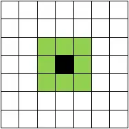 Plus généralement, le voisinage de Moore d'ordre d'une cellule est constitué de la cellule centrale et des cellules qui l'entourent à une distance de Tchebychev de au plus .