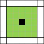 Le voisinage de Moore d'ordre 2 d'une cellule est constitué de la cellule centrale et des vingt-quatre cellules qui l'entourent.