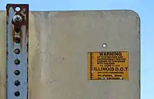 Un autocollant au dos d'un panneau de l'Illinois, supposé dissuader les voleurs, en indiquant que l'infraction est passible d'une amende de 1 000 dollars et d'emprisonnement.
