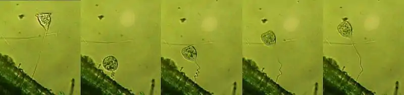 Séquence montrant la contraction en ressort du pédoncule d'une vorticelle et son redéploiement