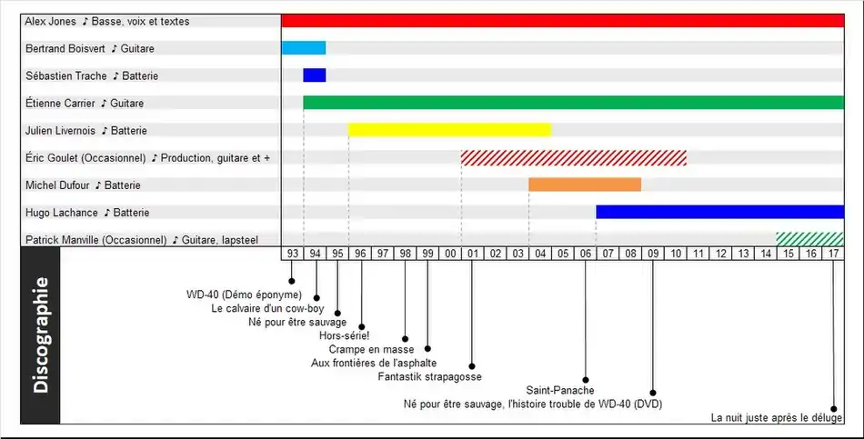 WD-40 est formé en 1993 d'Alex Jones (basse), Hugo Potvin (voix) et Bertrand Boisvert† (guitare)[3]. Premier démo éponyme en 1993.