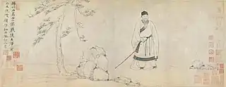 En ce qui concerne les portraits extérieurs à la cour et au clergé, on dispose de moins de témoignages, mais l'unique œuvre qui reste du plus grand portraitiste de la fin des Yuan, Wang Yi, nous en donne une idée, de même qu'un portrait anonyme dû au paysagiste Ni Zan[n 3]. En fait, Wang Yi réalise le portrait en collaboration avec Ni Zan, qui y porte une inscription datée de 1363. Il représente le poète lettré Yang Qian, ou Yang Zhuxi (« Bambou occidental », son nom d'artiste), flânant seul, muni d'un bâton, vêtu d'une robe et d'un couvre-chef. Wang Yi peint le personnage, Ni Zan les rochers et le pin. Des descriptions chinoises de la peinture louent l'habileté du portraitiste à saisir « la droiture et la respectabilité » de Yang Zhuxi. Bien que cela soit vrai, on doit aussi noter que sa caractérisation ne vient pas (comme l'affirment avec insistance les théoriciens chinois) d'une description pénétrante de la physionomie qui peut révéler la nature profonde du sujet — le visage est aimable et dépourvu d'expression — mais, comme c'est la coutume dans les portraits chinois, de la posture, des attributs, du décor, qui fonctionnent tous comme des signes destinés à être lus par le spectateur intelligent[2].