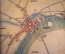Warneton a été fortifié très tôt, avant 1127, puisque celles-ci ont été détruites lorsque Bertulphe Errembault se réfugia chez son cousin Alard de Warneton après le meurtre de Charles Ier de Flandre[12]. Une enceinte fortifiée est visible sur les plus anciens sceaux de la ville en 1226, et une charte du comte de Flandre confirme la présence de cette fortification. En 1382, après destruction, une reconstruction de grande ampleur a lieu sur ordre de Yolande de Bar, reconstruisant également le château. Ce plan de 1382 est conservé aux Archives du Royaume[13].