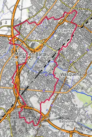 - Le Capreau qui vient du nom donné aux pièges que les pinsonneux du quartier confectionnèrent pour prendre les oiseaux est un quartier crée vers 1880[37] à l'époque ou des ouvriers et tisserands quittent les quartiers saturés de Roubaix et Tourcoing pour s'installer à la campagne, aux confins de Wasquehal. On trouve en 1881, une vingtaine de maisons ouvrières, une épicerie et l'Estaminet du Capreau[38]. Les habitants voulaient créer un quartier indépendant et une rivalité éclata entre ces derniers contre habitants du centre et la mairie de Wasquehal. Aux confins du Capreau, à la limite de Mouvaux et de Tourcoing se trouvait en 1876, le hameau de La Planche au Riez. Pour accéder à La Planche au Riez, les habitants devaient traverser le riez du Trichon[39] en passant sur une planche, ce qui a donné le nom de La Planche au Riez (Le riez du Trichon était une rivière qui prenait sa source à Mouvaux pour se jeter dans l’Espierres. Il a été recouvert de bitume et passe donc discrètement sous la ville). L'actuelle rue de La Planche au Riez perpétue le souvenir de cet ancien hameau.
