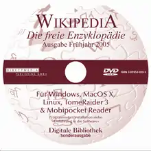 La version allemande de Wikipédia fut vendue sur CD-ROM, puis sur DVD à partir du deuxième semestre 2004 : le nombre de 10 000 CD-ROM vendus fut franchi en avril 2005. En avril 2007, une sélection d'environ 2 000 articles de la version anglaise fut éditée sur CD-ROM par la société française Linterweb[19]. À la même époque, le projet moulinWiki, initié par IESC-Geekcorps-Mali, proposa une version intégrale incluant tous les articles, sans les images, réunis sur une image disque de 554 Mo[20]. La diffusion d'un DVD d'une sélection d'articles Wikipédia en français a fait l'objet d'un projet équivalent au projet anglophone, mais il n'a pas abouti. Un projet de diffusion de documents électroniques imprimables sur un sujet donné, Les Cahiers de Wikipédia[Note 5], a lui aussi été abandonné.