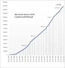 Au , l'édition en ukrainien contient 1 322 051 articles et compte 747 165 contributeurs, dont 3 339 contributeurs actifs et 50 administrateurs.