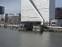 Vue panoramique du paysage urbain de Rotterdam depuis le pont Guillaume (2017) : l'île Noordereiland au premier plan à gauche et les gratte-ciels de Kop van Zuid en arrière plan.