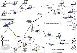Schéma montrant une configuration pour un réseau maillé filaire/sans fil, connecté en amont via une liaison VSAT (cliquez pour agrandir)