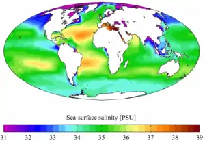 ![]() Moyenne annuelle en surface de salinité (WOA 2001) |