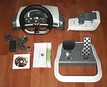 Le Xbox 360 Wireless Racing Wheel (volant de course sans fil Xbox 360) a été développé par Microsoft pour la Xbox 360 et a été présenté à l’E3 2006. Lancé en novembre 2006, le contrôleur du volant a retour de force comprend les boutons de la manette de jeu standard ainsi que les pédales d’accélérateur et de frein montés au sol. Bien que la molette puisse fonctionner réellement sans fil à partir d’une batterie Xbox 360 standard (rechargeable ou de deux piles AA), l’utilisation des fonctions de retour de force et de résistance active nécessite un adaptateur secteur externe[1].
