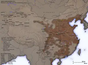 Les dynasties et États de la Chine antique sont souvent en contact avec les Xianyun et les Xirong, deux peuples nomades. Durant les siècles suivants, l'historiographie chinoise en vient à considérer que les Xiongnu descendent de l'un ou l'autre de ces peuples[19]. Ces peuples nomades se sont régulièrement retrouvés en conflit avec les dynasties chinoises Shang et surtout Zhou, qui les ont souvent conquis et asservis durant leurs périodes d'expansion[19]. Pendant la période des Royaumes combattants, les armées des États de Qin, Zhao et Yan annexent plusieurs territoires habités par divers peuples Hu[20]. C'est dans ce cadre qu'il est fait mention pour la première fois des Xiongnu dans les archives chinoises, lorsqu'en ils participent à une coalition des États de Wei, Han et Zhao contre Qin[21], puis en -245, à l'occasion d'un affrontement contre le royaume de Zhao.